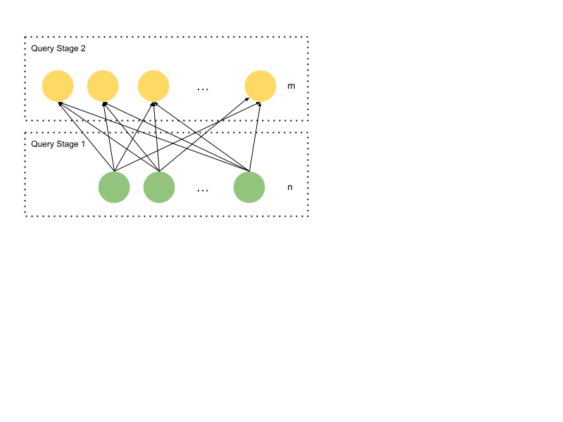 To set up the distributed execution, Prestissimo first selects the workers from the pool of Prestissimo server processes it manages. Assuming that stage 1 is 10 workers wide, it selects 10 server processes and sends the first stage plan to them. It then selects 100 workers for stage 2 and sends the second stage plan to these. The last stage that gathers the result has only one worker, so Prestissimo sends the final plan to only one worker. The set of workers for each stage may overlap, so a single worker process may host multiple stages of one query.